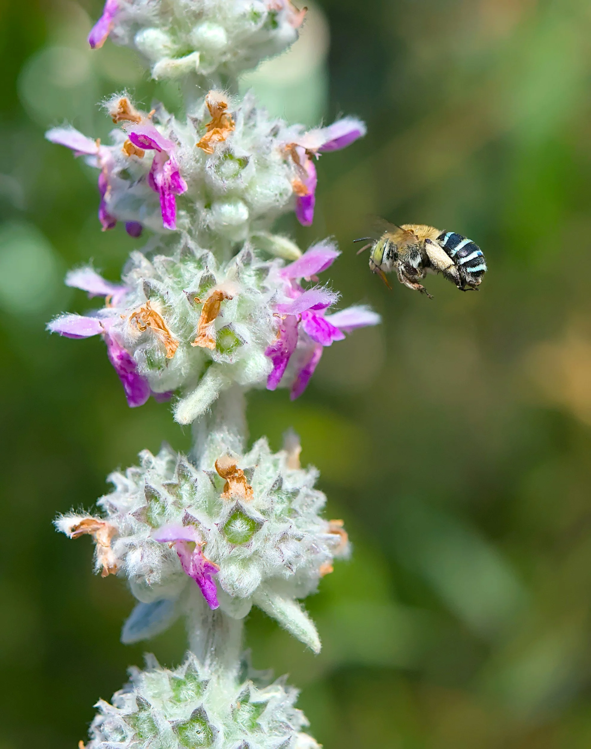 A native, blue-banded bee was spotted visiting flowers on some of the new plants. We soon discovered these beautiful solitary bees were digging their nests into soil on our property.